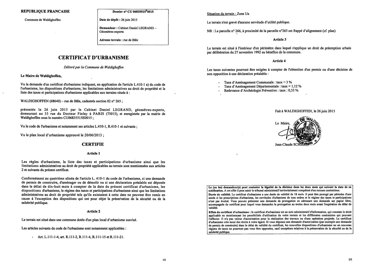 Certificat d'urbanisme délivré au Cabinet Daniel LEGRAND, géomètre-expert
