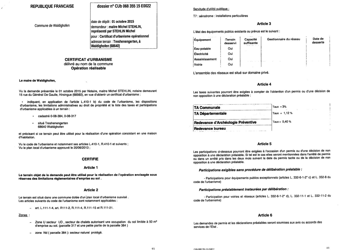 Certificat d'urbanisme opérationnel délivré à Maître STEHLIN, notaire