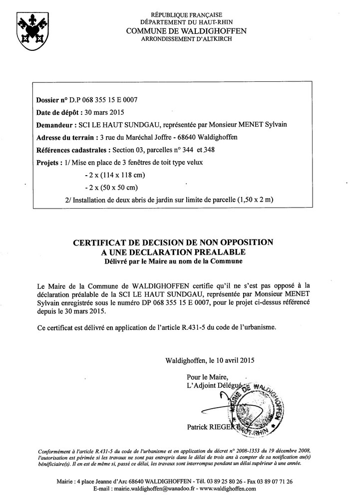 Vous êtes ici : Accueil Mairie Affichage public Annexes affichage public 2015 Décision à la déclaration préalable de la SCI LE HAUT SUNDGAU