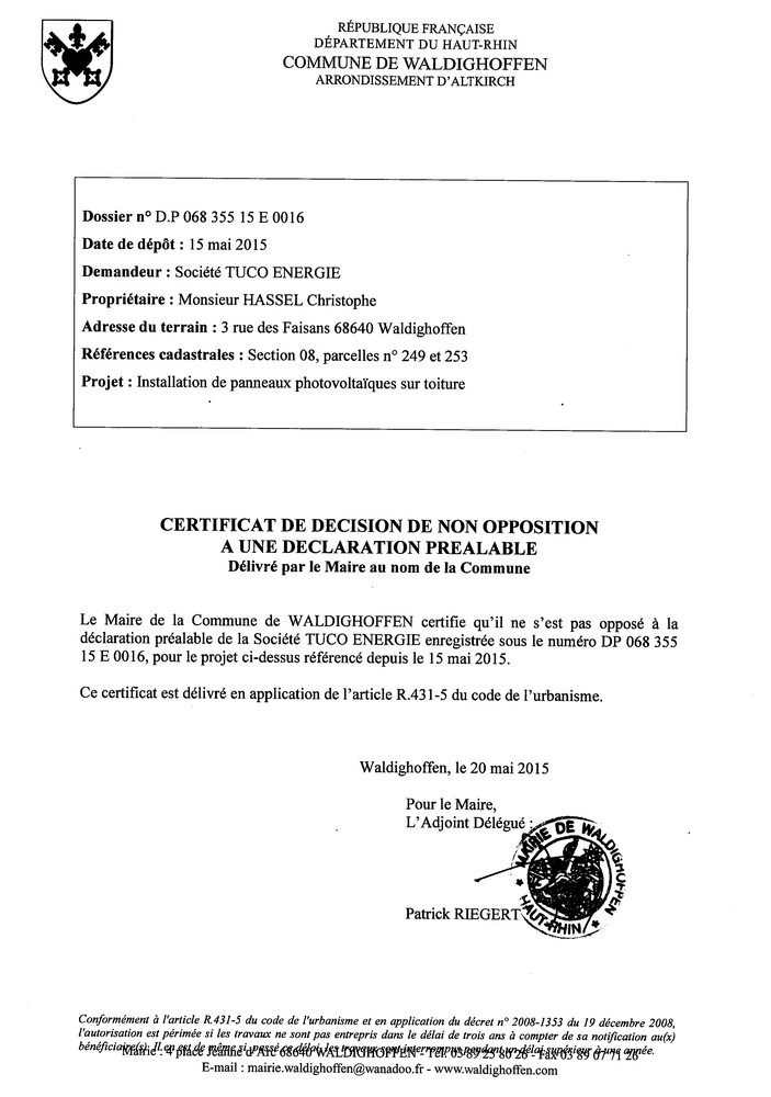 Vous êtes ici : Accueil Mairie Affichage public Annexes affichage public 2015 Décision à la déclaration préalable de la Société TUCO ENERGIE