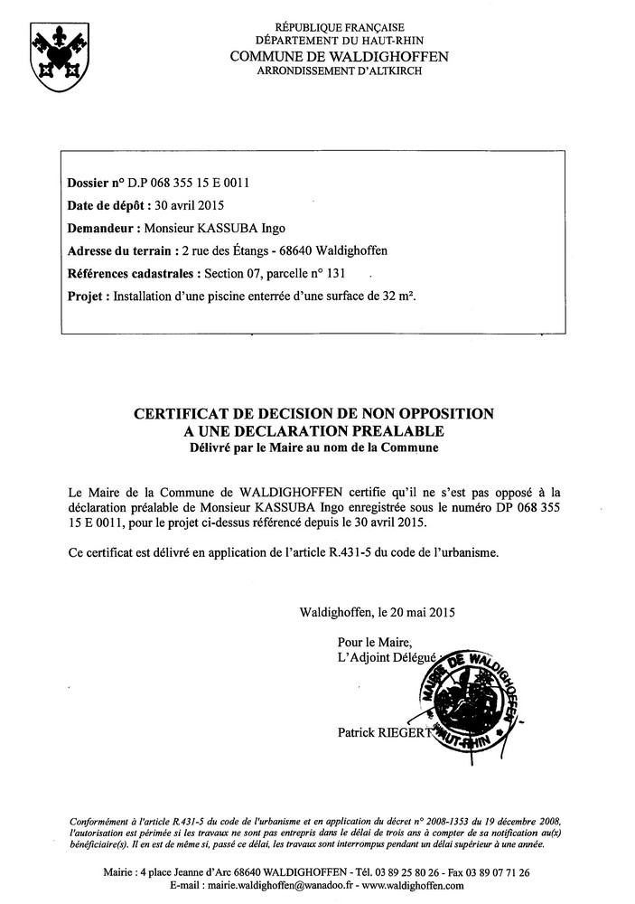 Vous êtes ici : Accueil Mairie Affichage public Annexes affichage public 2015 Décision à la déclaration préalable de M. KASSUBA Ingo