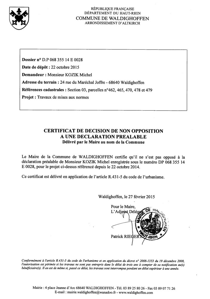 Vous êtes ici : Accueil Mairie Affichage public Annexes affichage public 2015 Décision à la déclaration préalable de M. KOZIK Michel