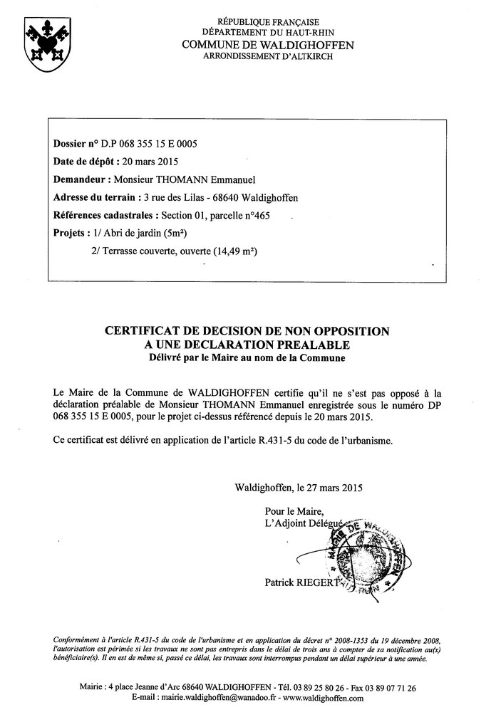 Vous êtes ici : Accueil Mairie Affichage public Annexes affichage public 2015 Décision à la déclaration préalable de M. THOMANN Emmanuel