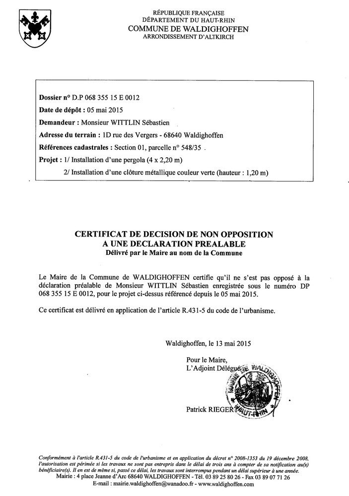 Vous êtes ici : Accueil Mairie Affichage public Annexes affichage public 2015 Décision à la déclaration préalable de M. WITTLIN Sébastien