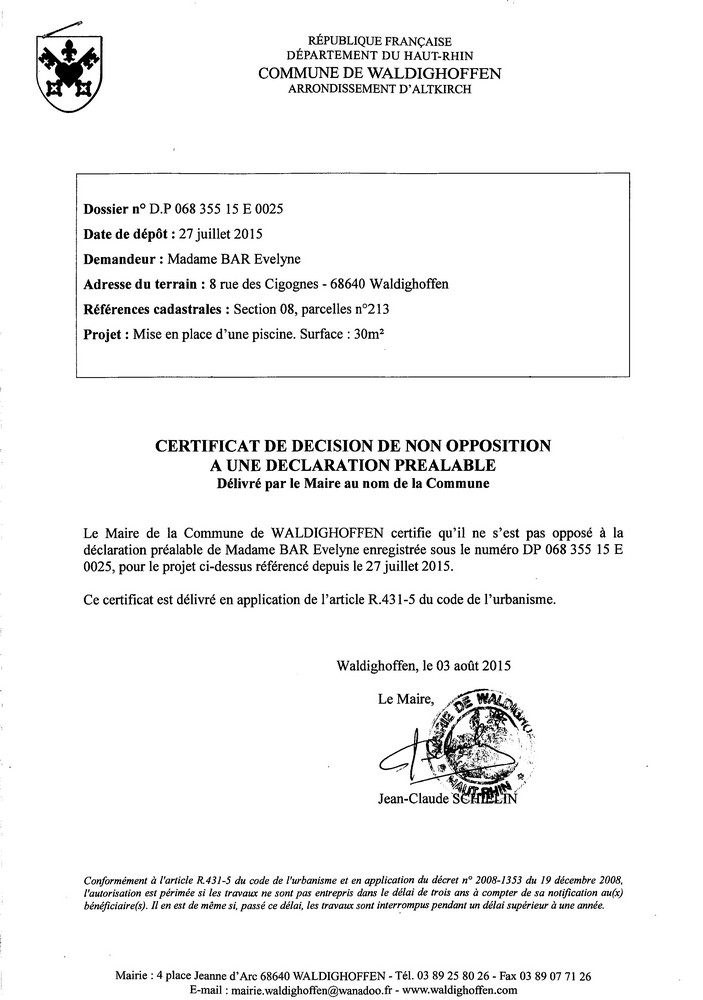 Vous êtes ici : Accueil Mairie Affichage public Annexes affichage public 2015 Décision à la déclaration préalable de Mme BAR