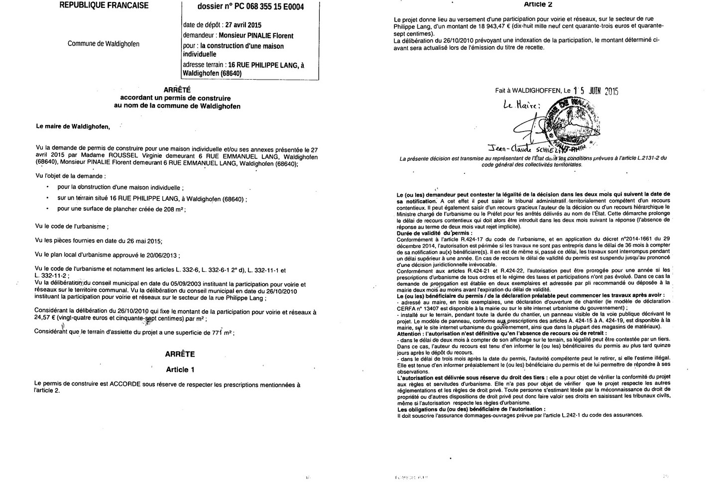 Décision à la demande de construire de M. PINALIE et Mlle ROUSSEL