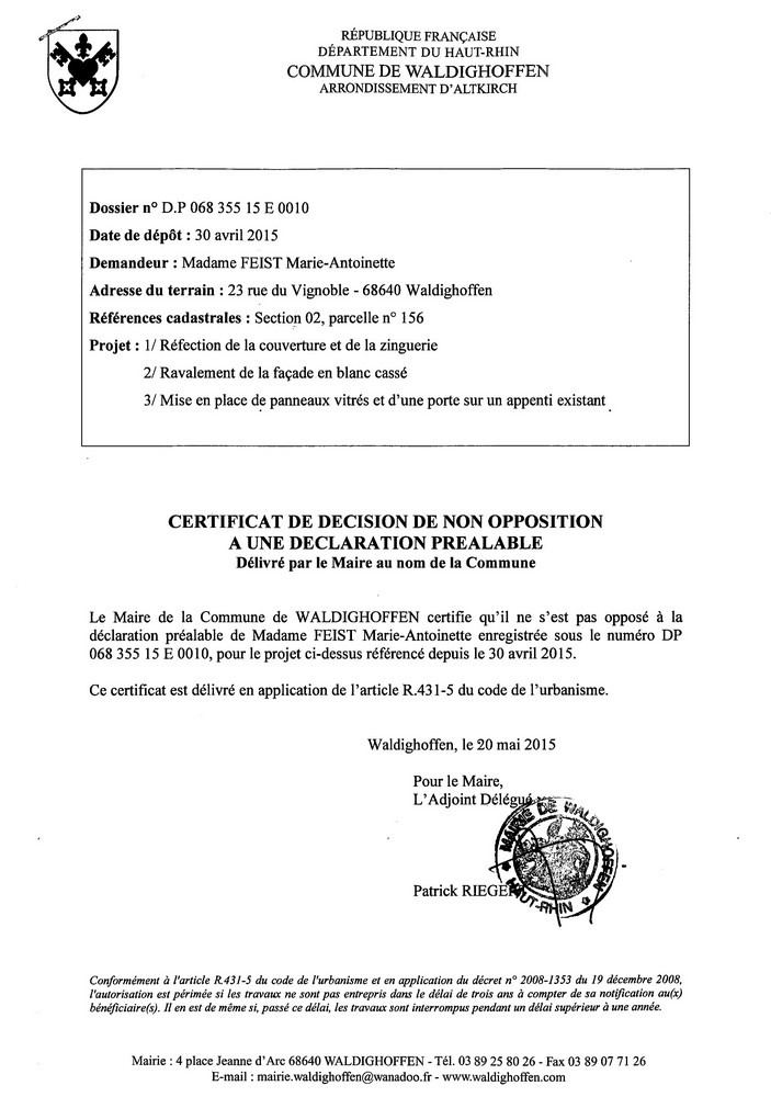 Vous êtes ici : Accueil Mairie Affichage public Annexes affichage public 2015 Déclaration préalable pour un terrain situé au 23 rue du Vignoble