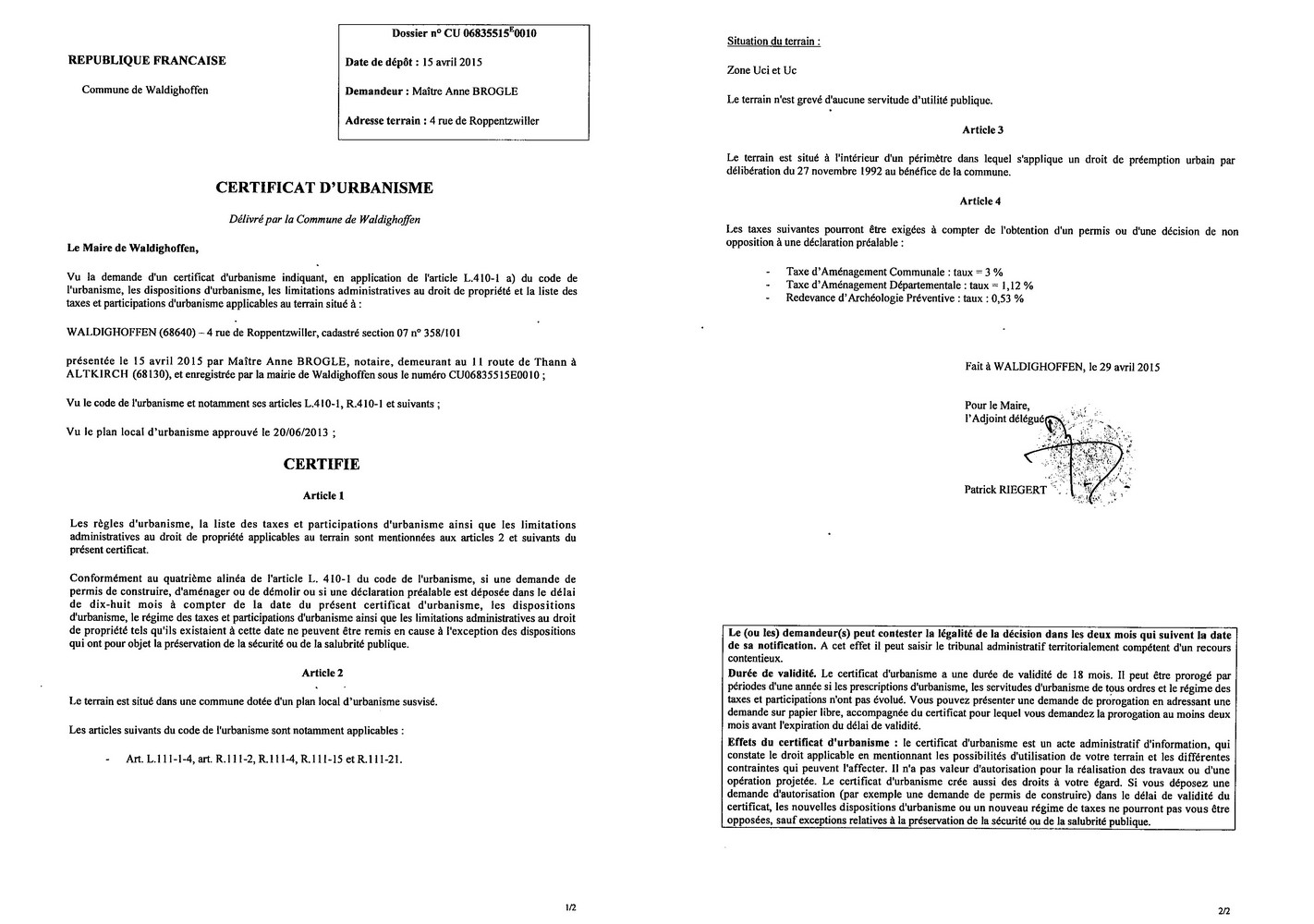Une demande de certificat d'urbanisme pour un terrain situé au 4 rue de Roppentzwiller a été déposée en Mairie par Maître Anne BROGLE