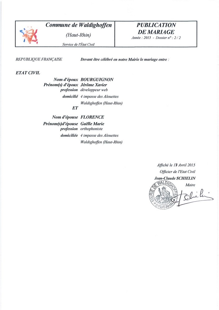 Publication de mariage projeté entre Monsieur BOURGUIGNON Jérôme et Mademoiselle FLORENCE Gaëlle domiciliés à WALDIGHOFFEN au 4 Impasse des Alouettes