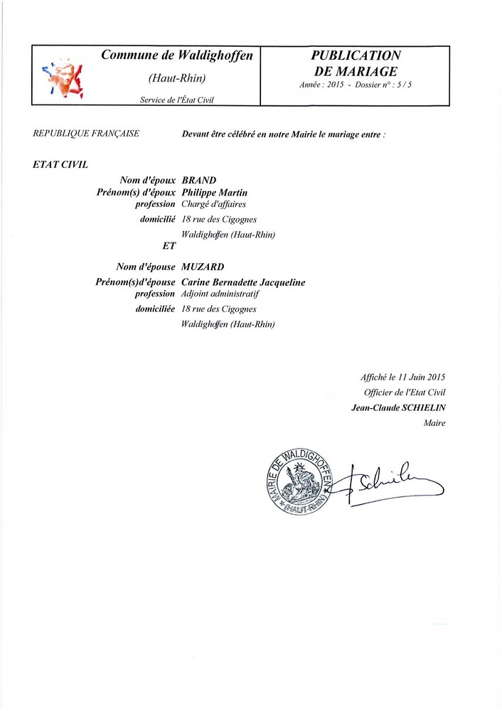 Publication de mariage projeté entre Monsieur BRAND Philippe et Mademoiselle MUZARD Carine domiciliés à WALDIGHOFFEN au 18 rue des Cigognes
