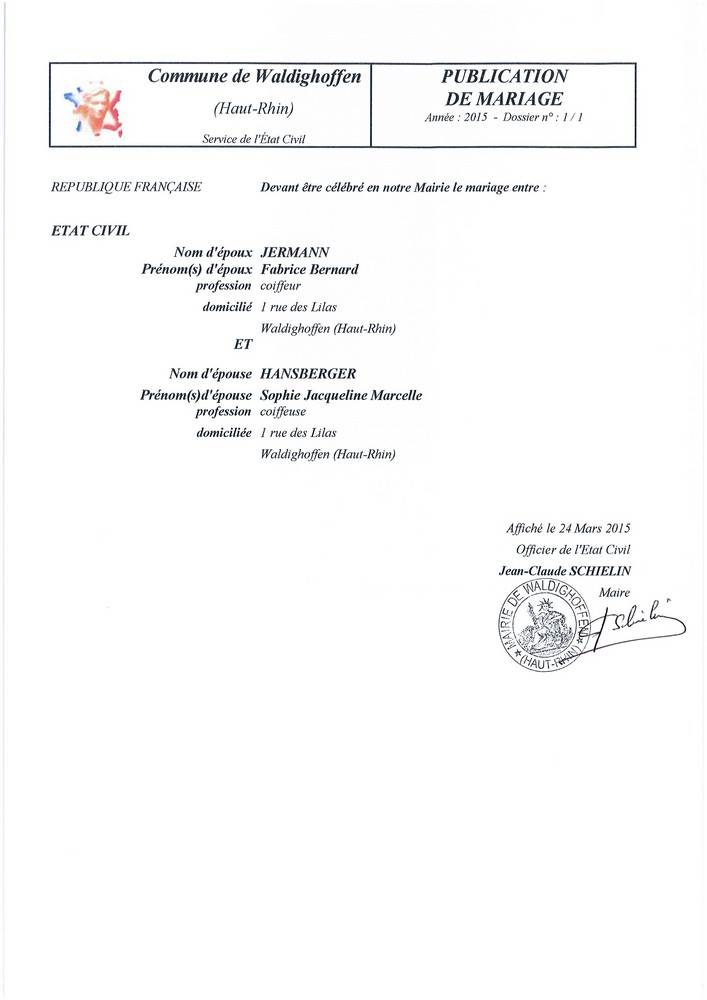 Publication de mariage projeté entre Monsieur JERMANN Fabrice et Mademoiselle HANSBERGER Sophie domiciliés à WALDIGHOFFEN au 1 rue des Lilas