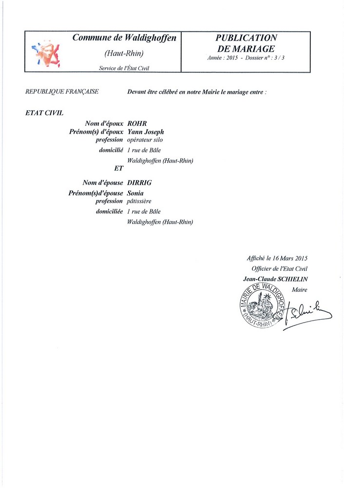 Vous êtes ici : Accueil Mairie Affichage public Annexes affichage public 2015 Publication de mariage entre M. ROHR et Mlle DIRRIG