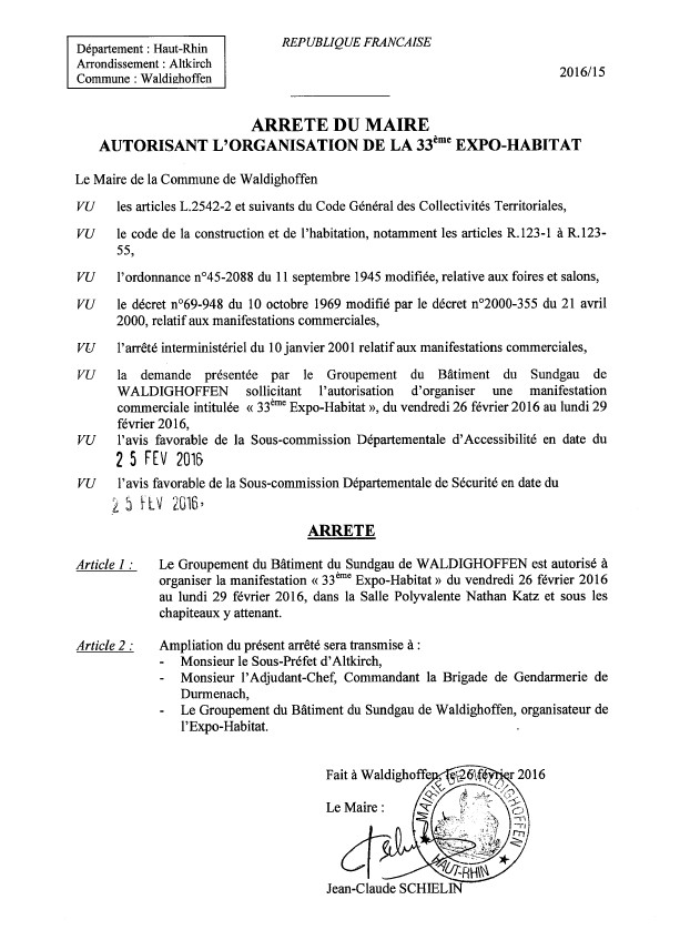 Arrêté du Maire autorisant l'utilisation de la Salle polyvalente en foire expo