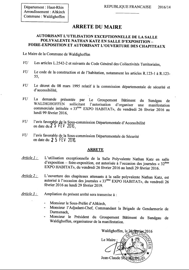 Arrêté du Maire autorisant l'utilisation de la Salle polyvalente en foire expo