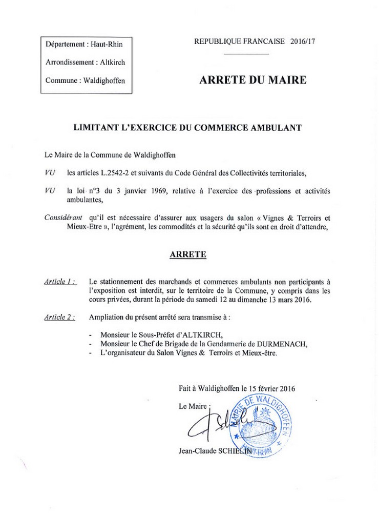 Arrêté du Maire limitant l'exercice du commerce ambulant à l'occasion du salon Vignes et Terroirs et Mieux-Etre