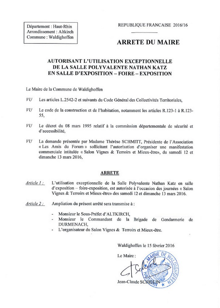 Arrêté du Maire autorisant l'Association "Les Amis du forum" à utiliser la Salle polyvalente en Salle d'expo - foire exposition