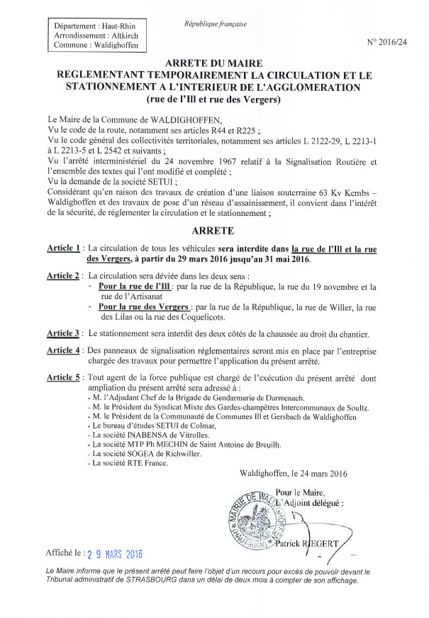 Arrêté du Maire règlementant la circulation : rue de l'Ill et rue des Vergers