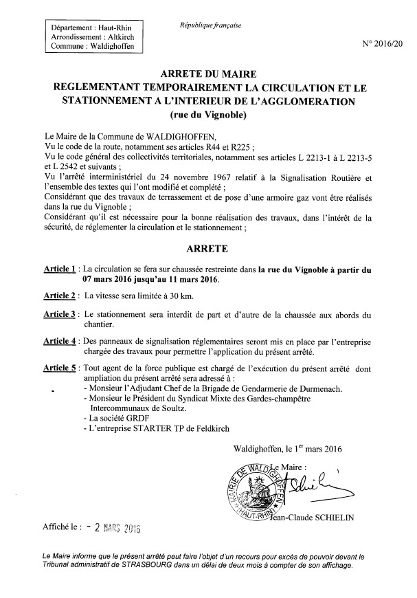 Vous êtes ici : Accueil Mairie Affichage public Annexes affichage public 2016 Arrêté du Maire règlementant la circulation rue du Vignoble