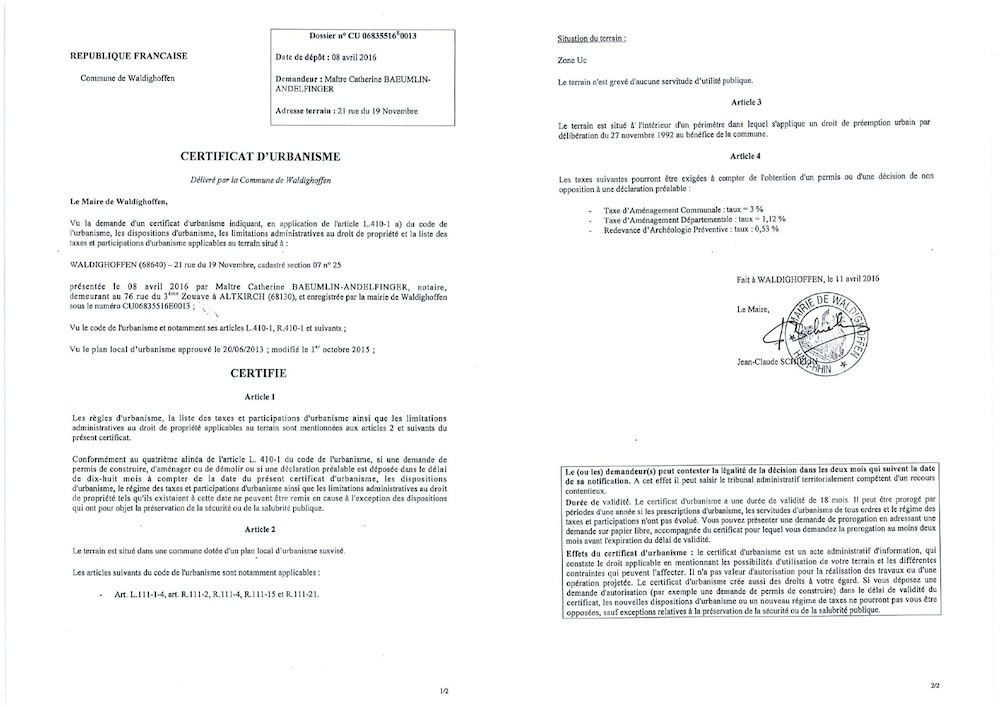 Certificat d'urbanisme délivré à Maitre BAEUMLIN, notaire