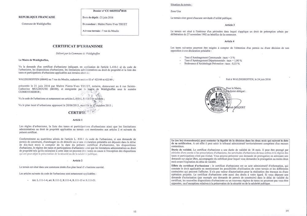 Certificat d'urbanisme CU06835516E0018- Maitre Pierre-Yves THUET