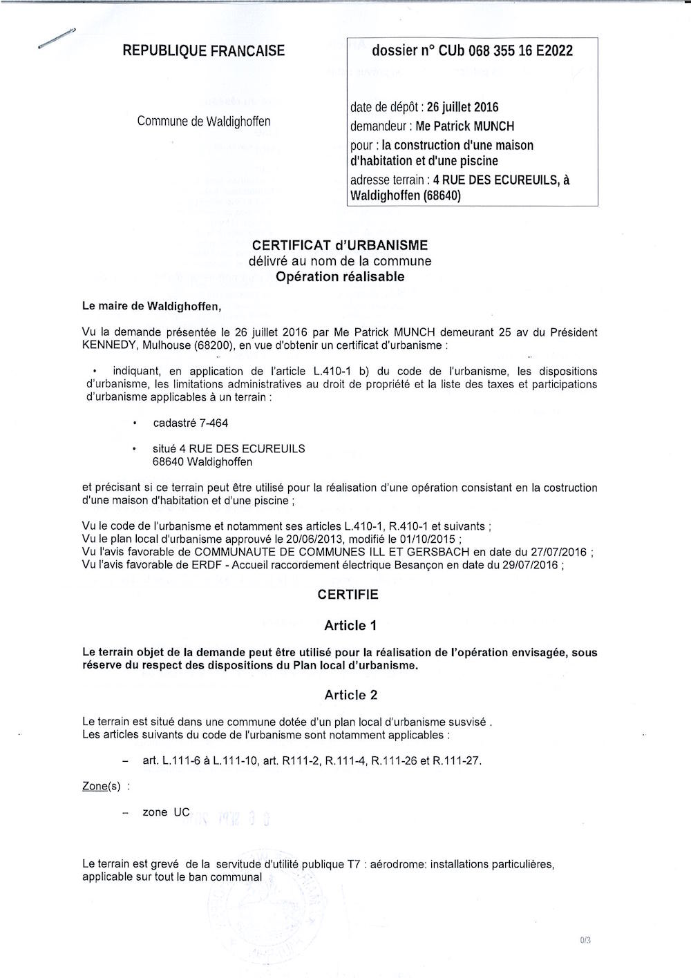 Certificat d'urbanisme CUb16E2022 délivré à Maitre Munch Patrick