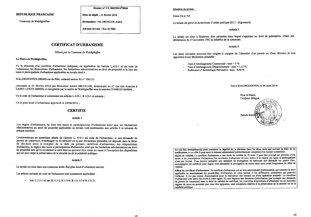 Certificat d'urbanisme délivré à M. DROXLER André