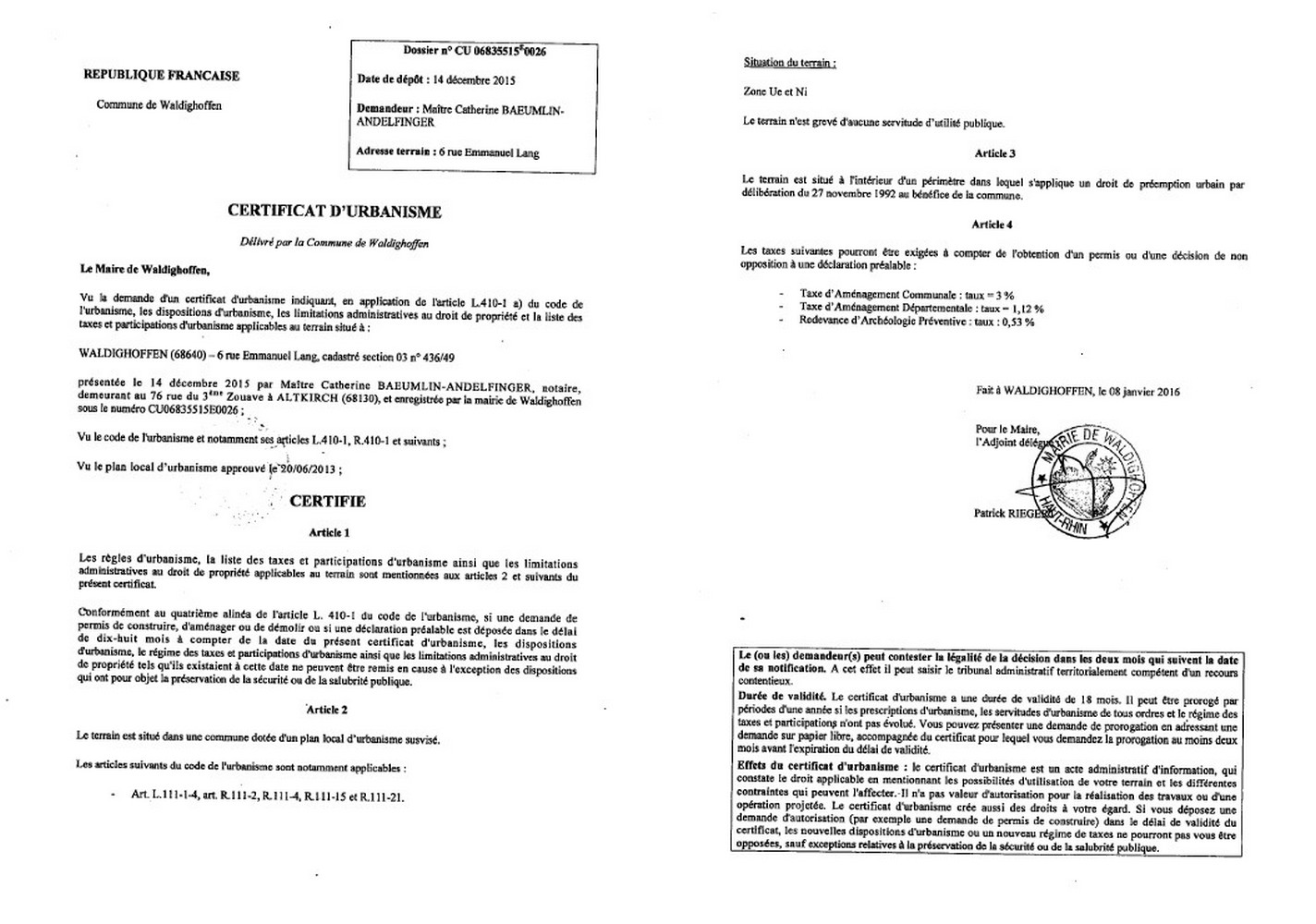 Certificat d'urbanisme délivré à Maître BAEUMLIN-ANDELFINGER, notaire