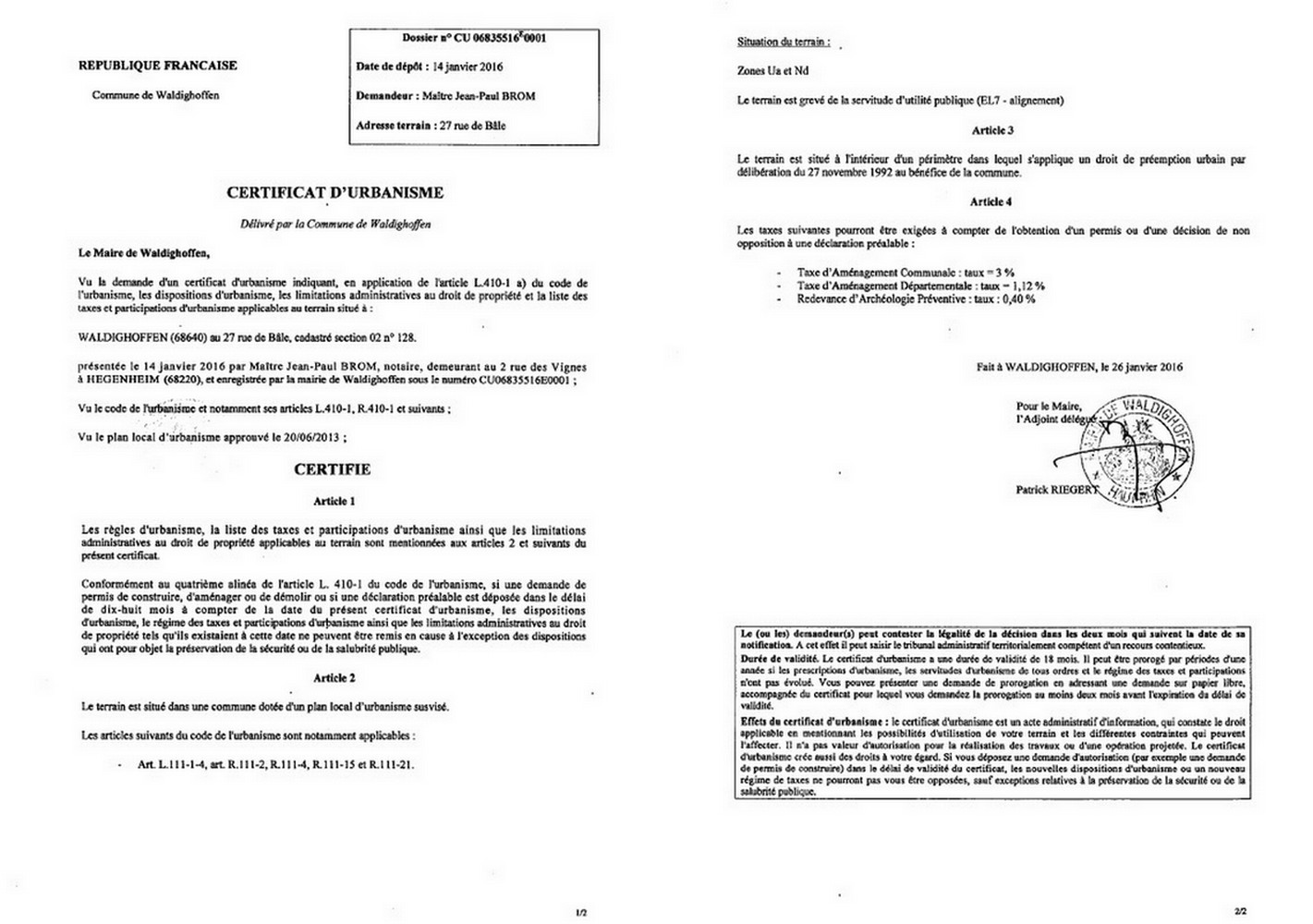 Certificat d'urbanisme délivré à Maître BROM, notaire