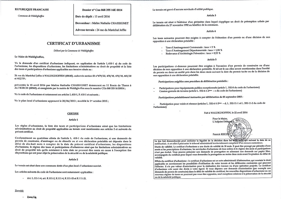 Certificat d'urbanisme délivré à Maître CHASSIGNET, notaire