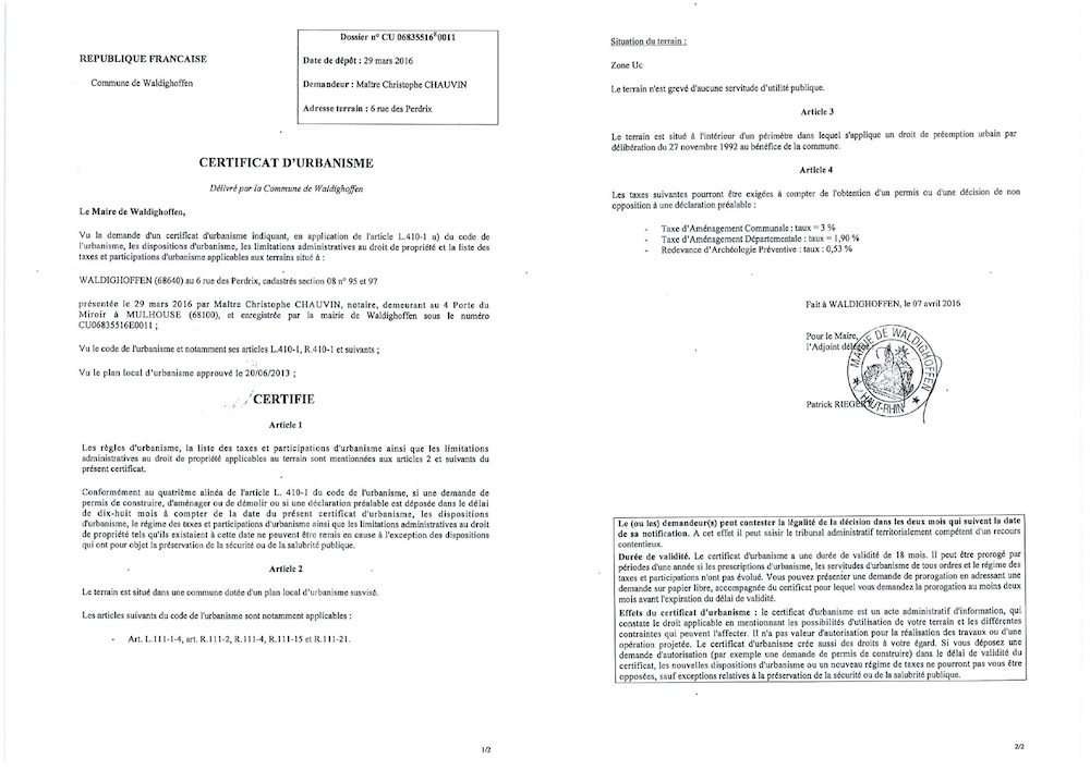 Certificat d'urbanisme délivré à Maître CHAUVIN, notaire