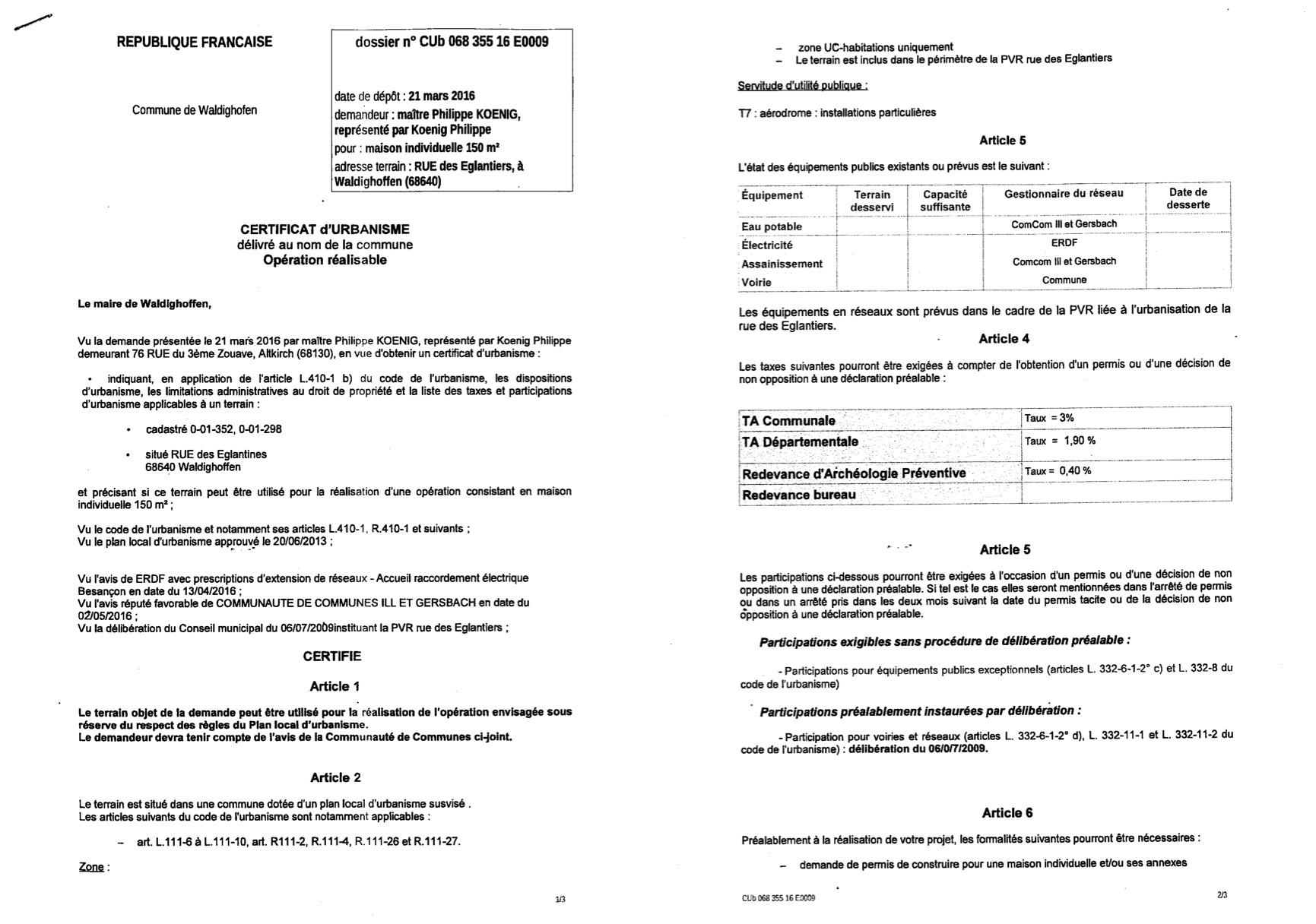 Certificat d'urbanisme délivré à Maître KOENIG, notaire