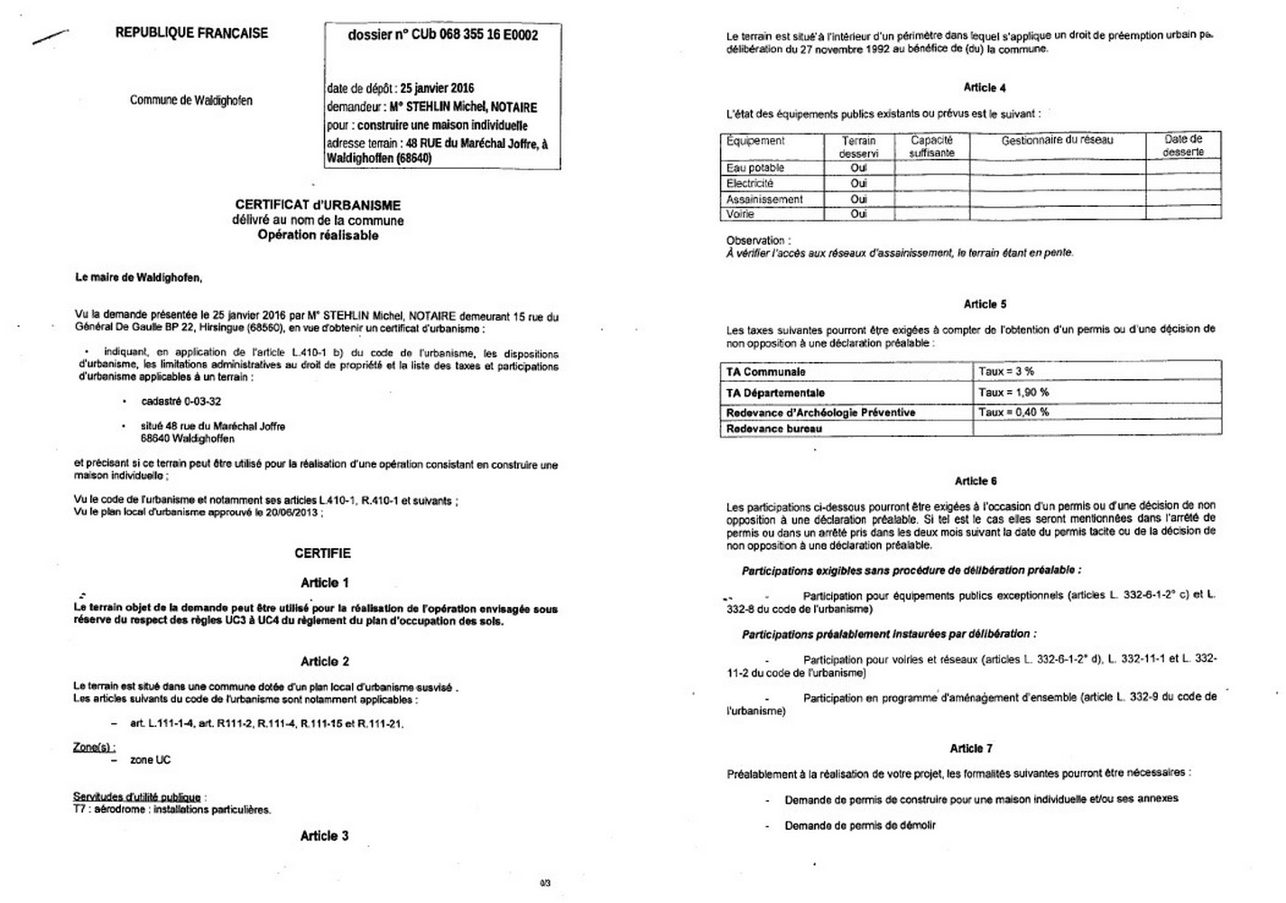 Vous êtes ici : Accueil Mairie Affichage public Annexes affichage public 2016 Certificat d'urbanisme délivré à Maître STEHLIN, notaire