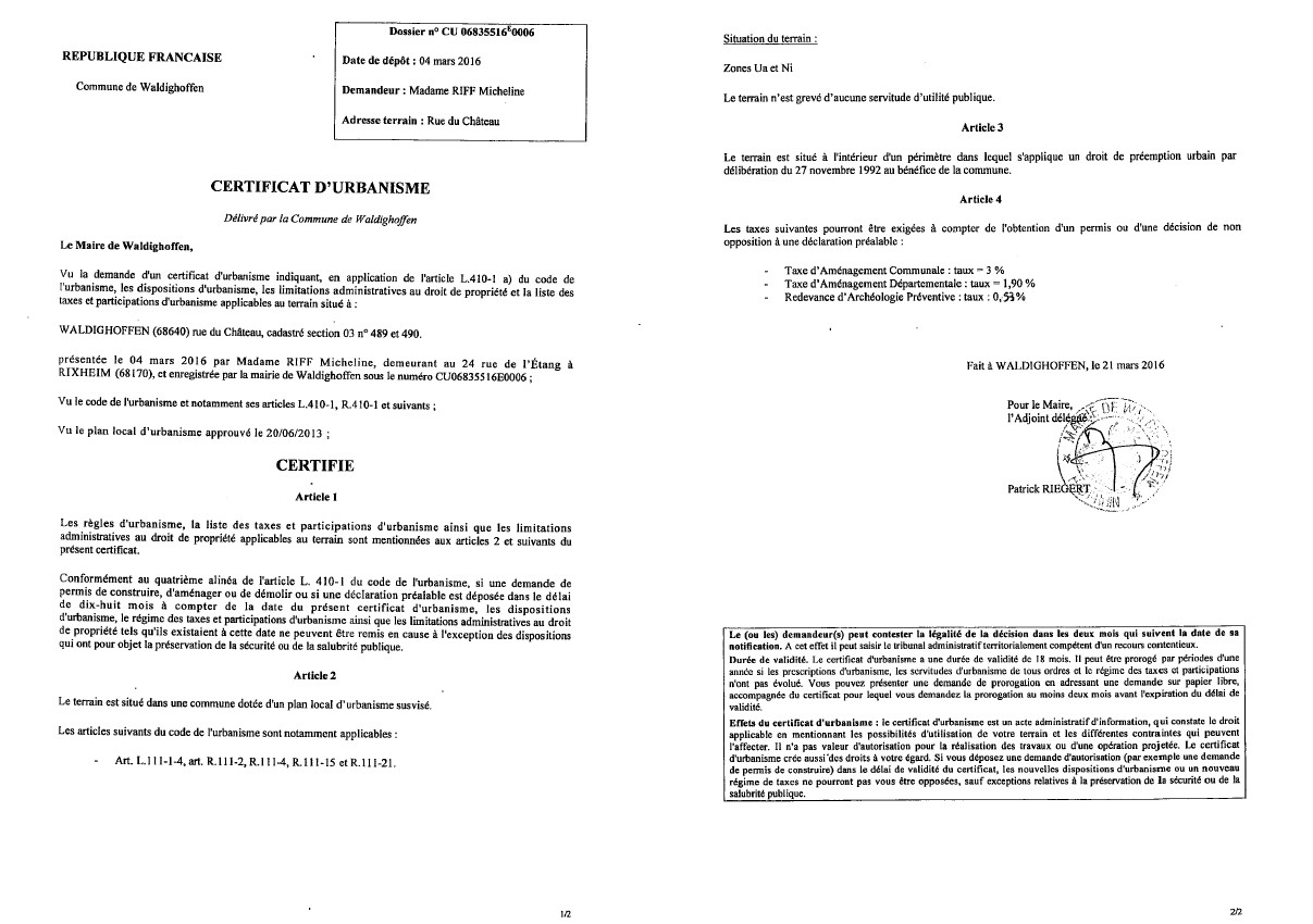 Un certificat d'urbanisme a été établi pour Madame RIFF Micheline, concernant une parcelle située dans la rue du Château