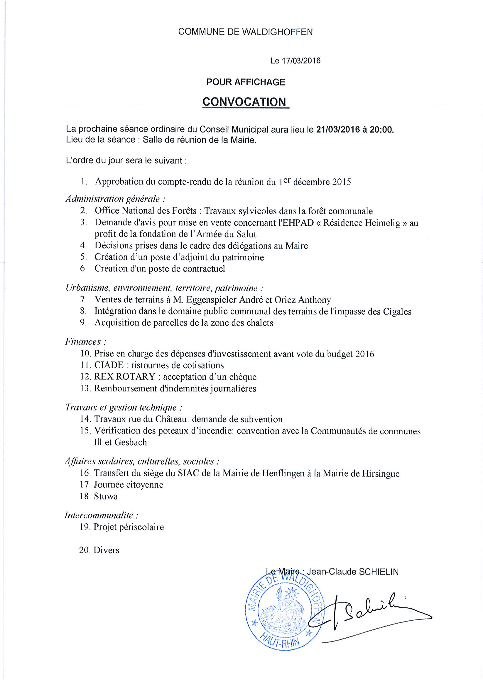 Vous êtes ici : Accueil Mairie Affichage public Annexes affichage public 2016 Convocation du Conseil Municipal le lundi 21 mars 2016