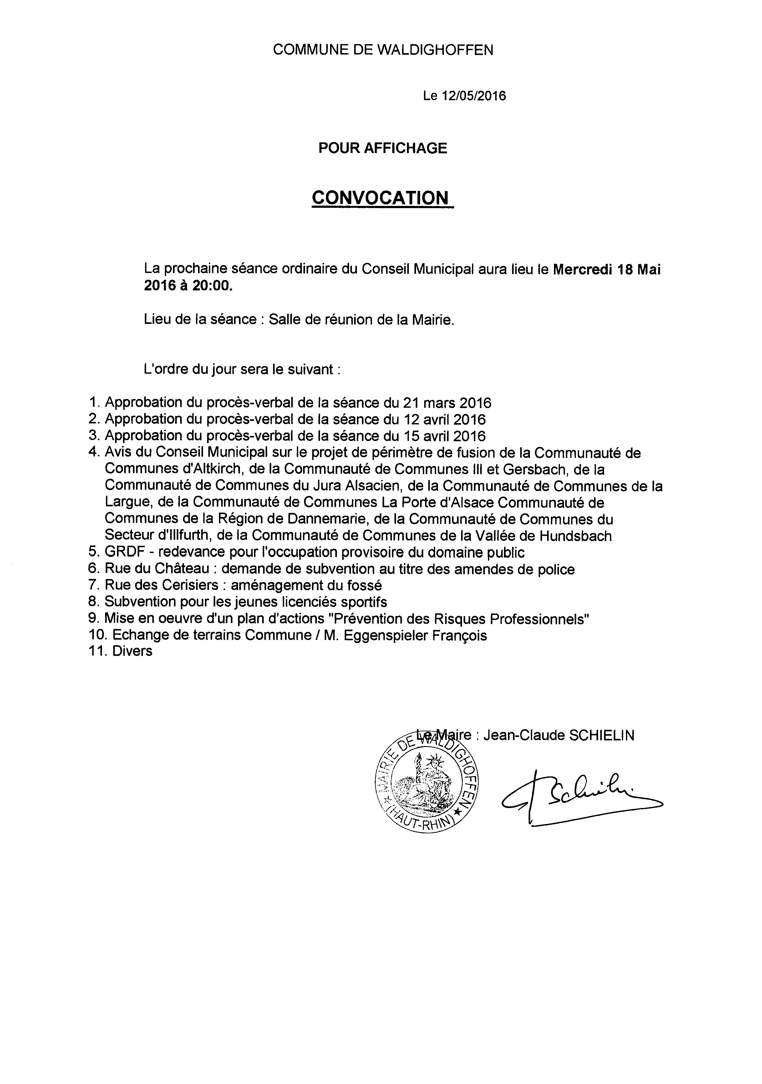 Convocation du Conseil Municipal le mercredi 18 mai 2016