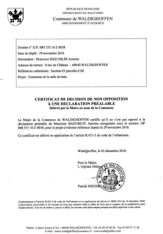 Vous êtes ici : Accueil Mairie Affichage public Annexes affichage public 2016 Décision à la déclaration préalable de M. BAEUMLIN Antoine