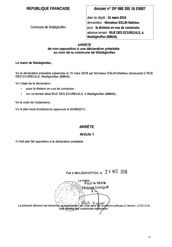 Vous êtes ici : Accueil Mairie Affichage public Annexes affichage public 2016 Décision à la déclaration préalable de M. EGLIN