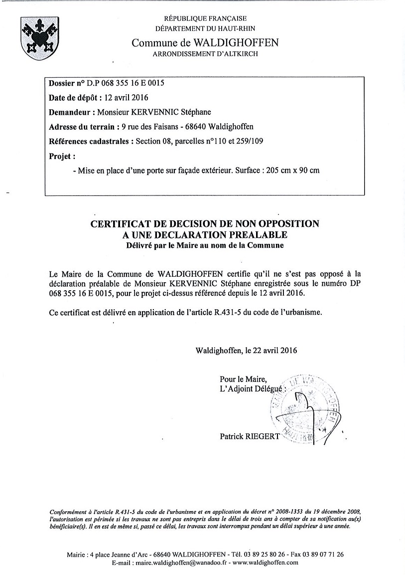 Vous êtes ici : Accueil Mairie Affichage public Annexes affichage public 2016 Décision à la déclaration préalable de M. KERVENNIC Stéphane