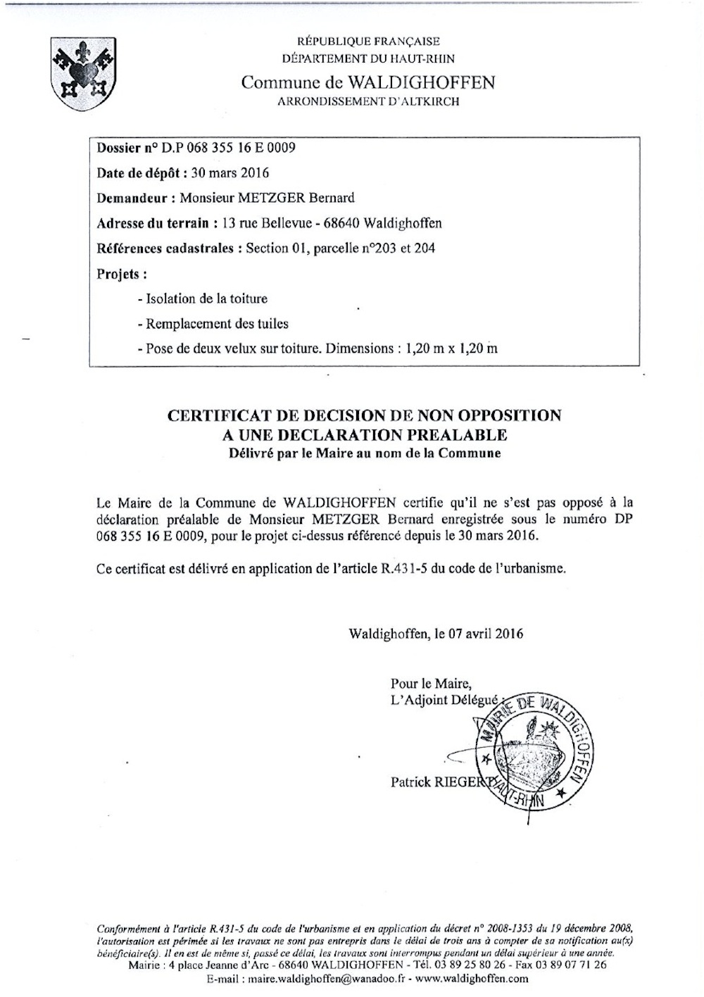 Vous êtes ici : Accueil Mairie Affichage public Annexes affichage public 2016 Décision à la déclaration préalable de M. METZGER Bernard