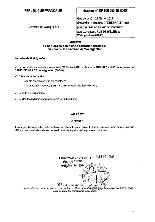 Vous êtes ici : Accueil Mairie Affichage public Annexes affichage public 2016 Décision à la déclaration préalable de Mme GRENTZINGER