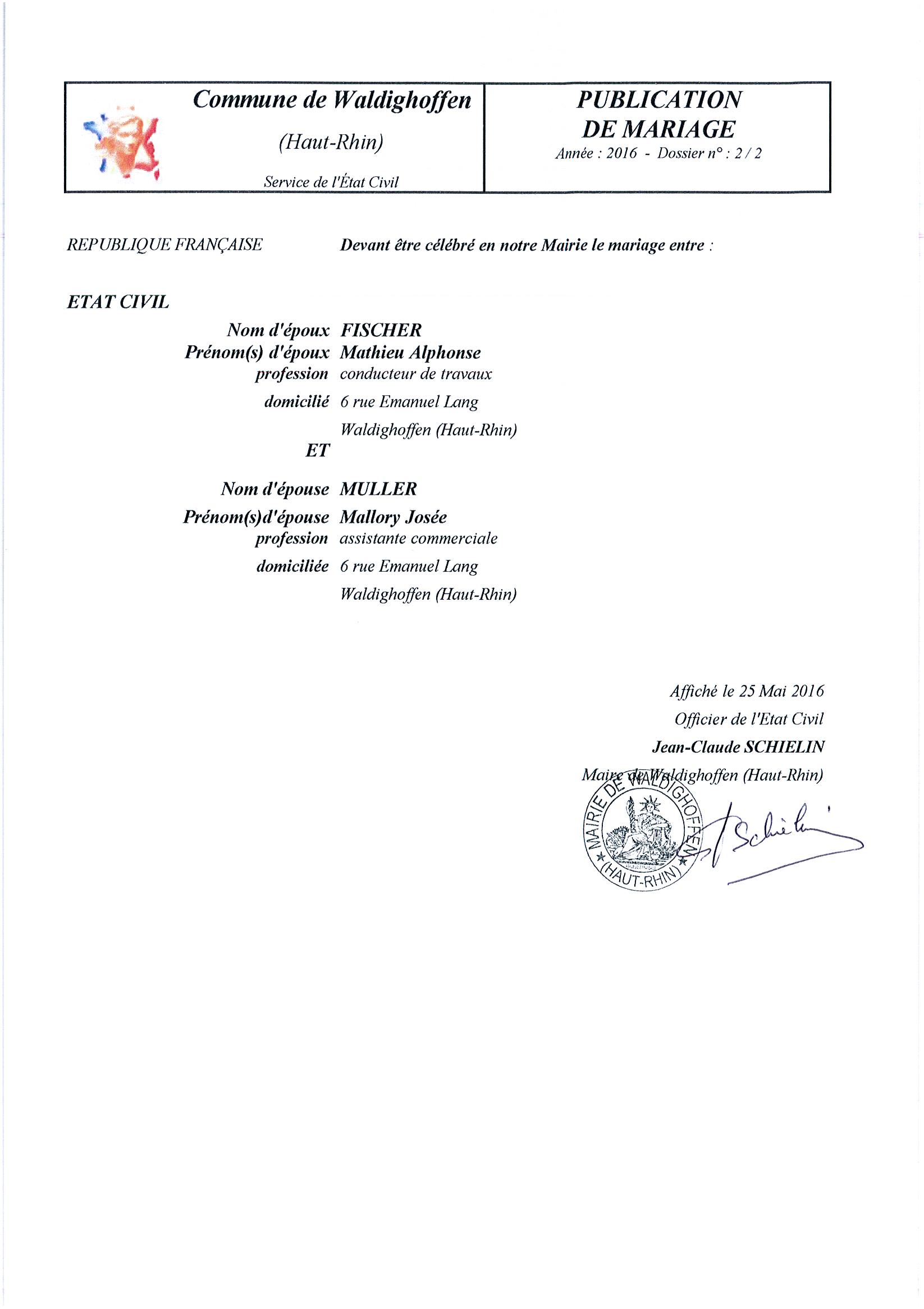Vous êtes ici : Accueil Mairie Affichage public Annexes affichage public 2016 Publication de mariage entre M. FISCHER et Mlle MULLER