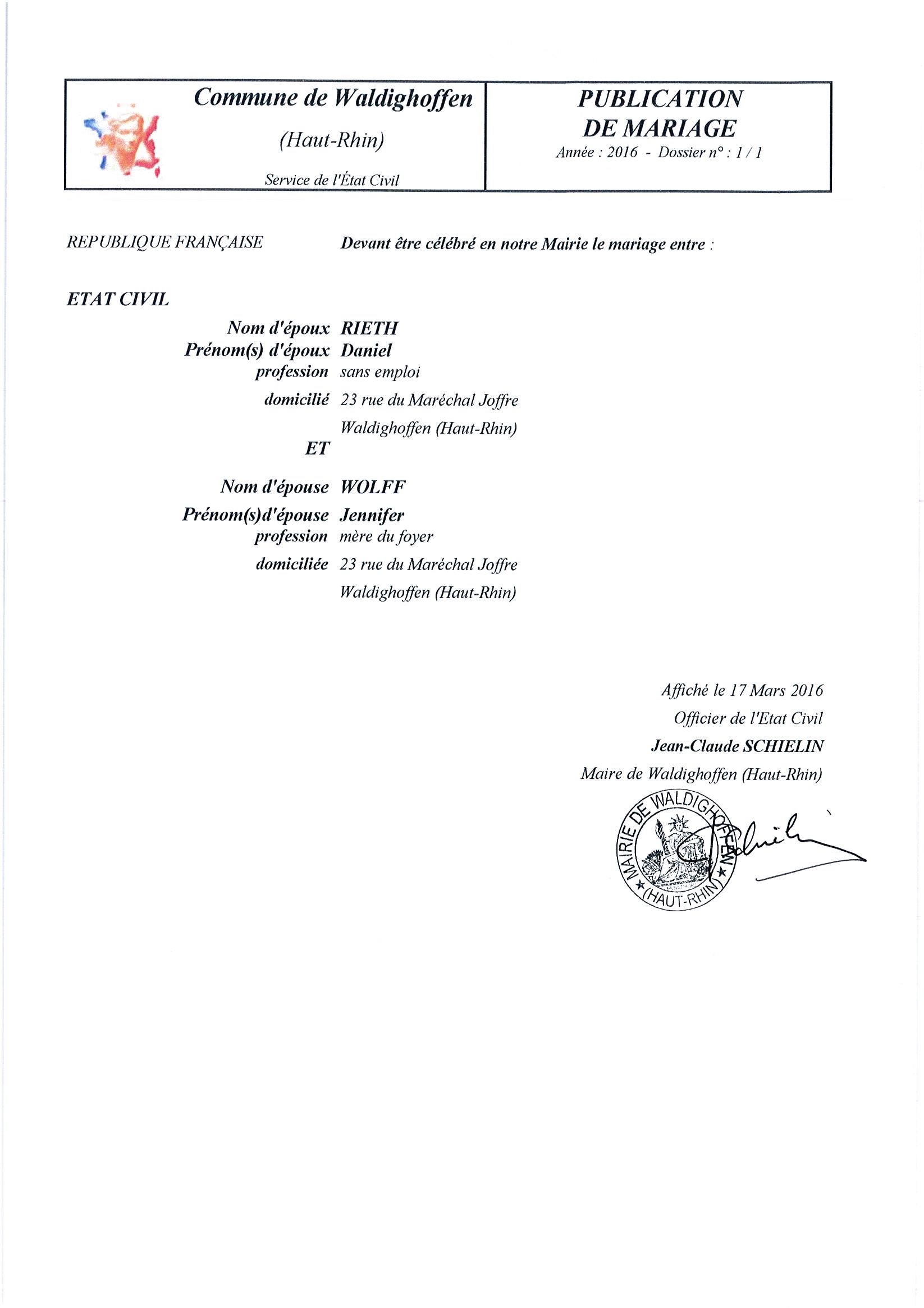 Publication de mariage projeté entre Monsieur RIETH Daniel et Mademoiselle WOLFF Jennifer domiciliés à WALDIGHOFFEN au 23 rue du Maréchal Joffre