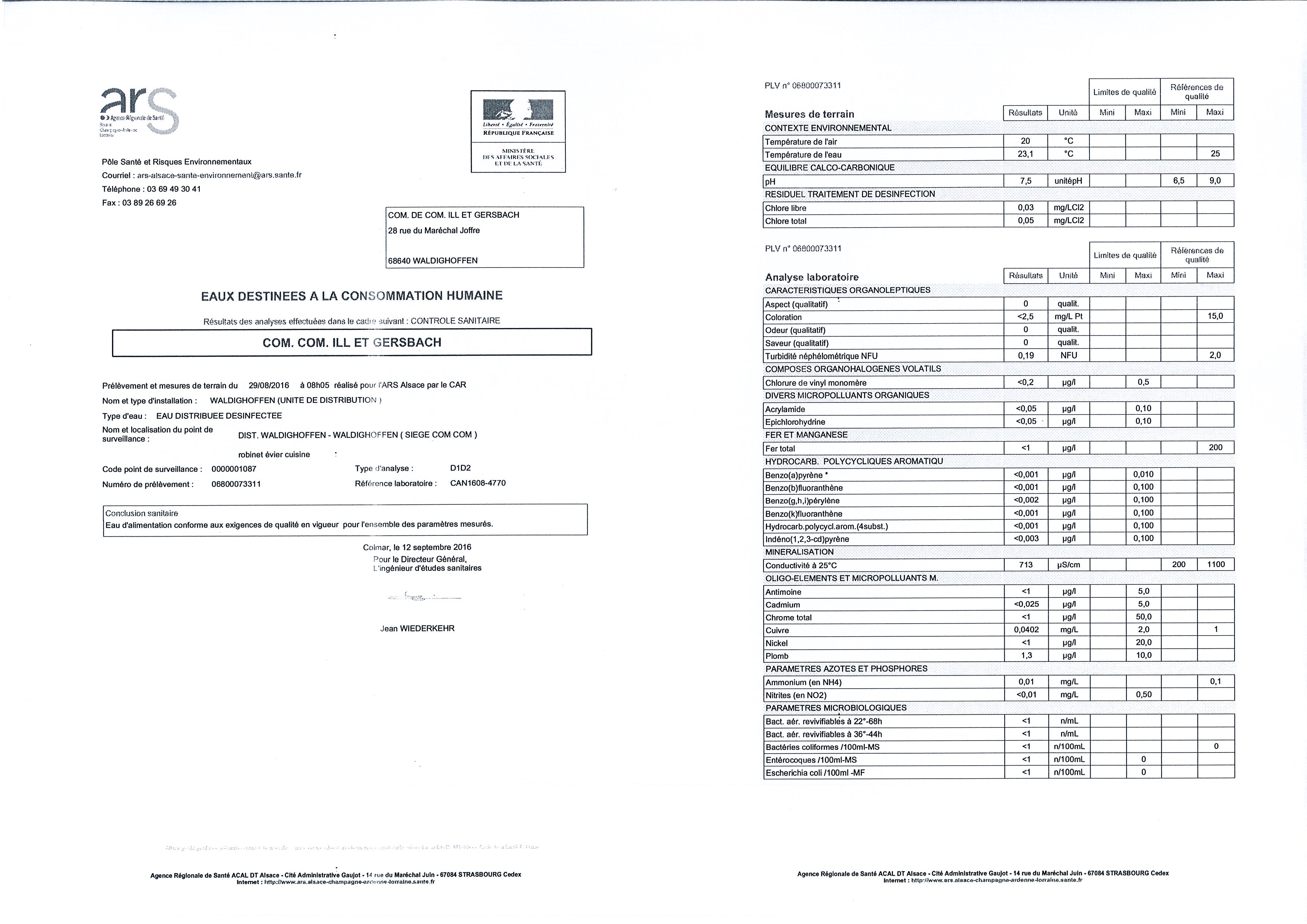 Copie du rapport d'analyse de l'eau potable de Waldighoffen. Prélèvement n°06800073211 effectué le 29 août 2016