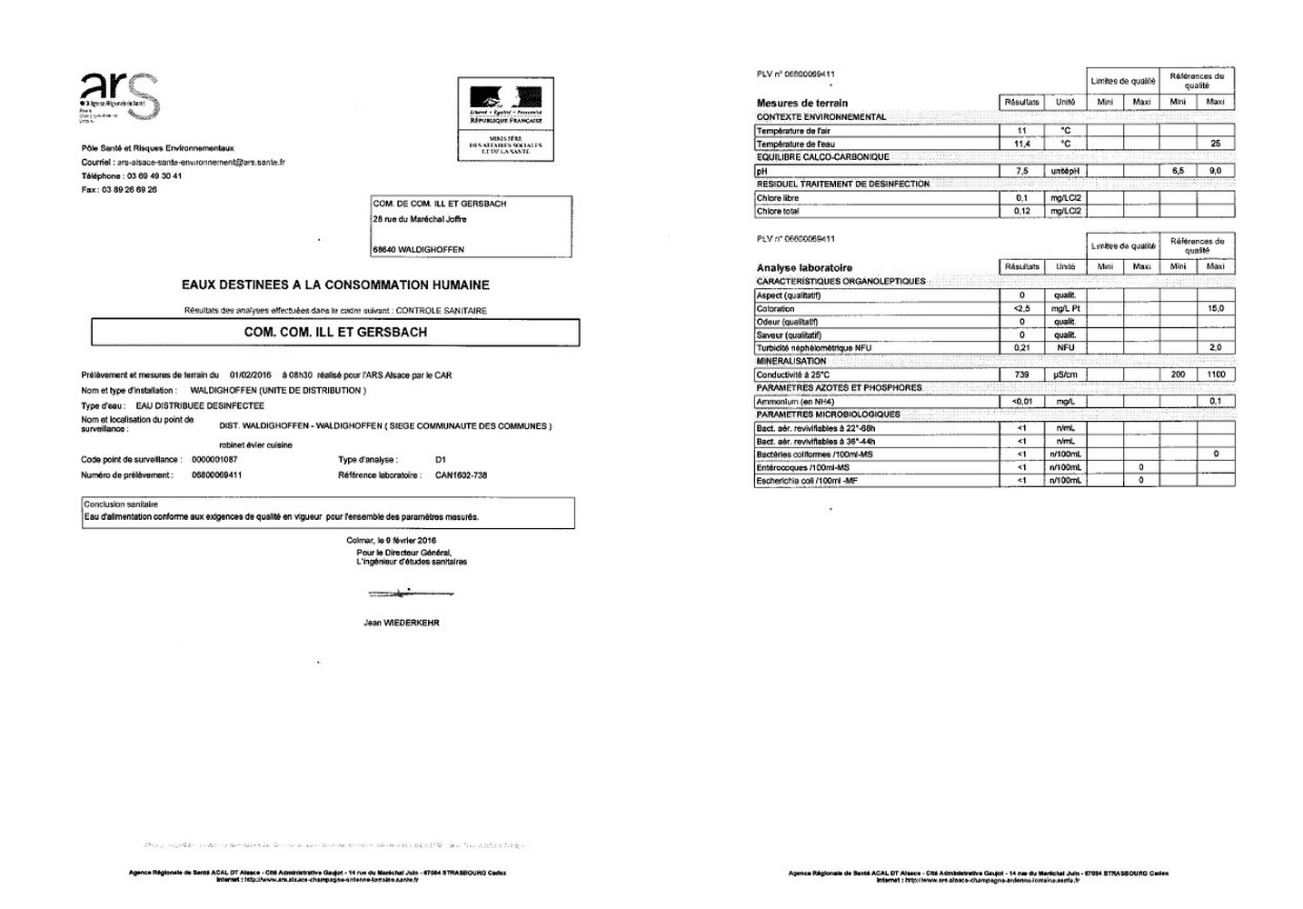 Copie des rapports d'analyses de l'eau potable de Waldighoffen. Prélèvements n°06800069410 et n°06800069411 effectués le 1er février 2016