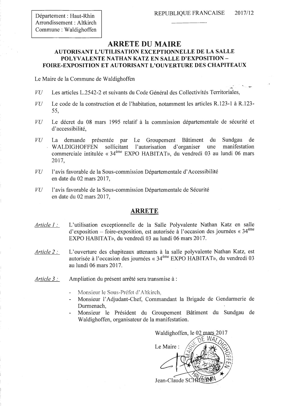 Arrêté autorisant l'utilisation de la salle polyvalente et l'ouverture de chapiteaux