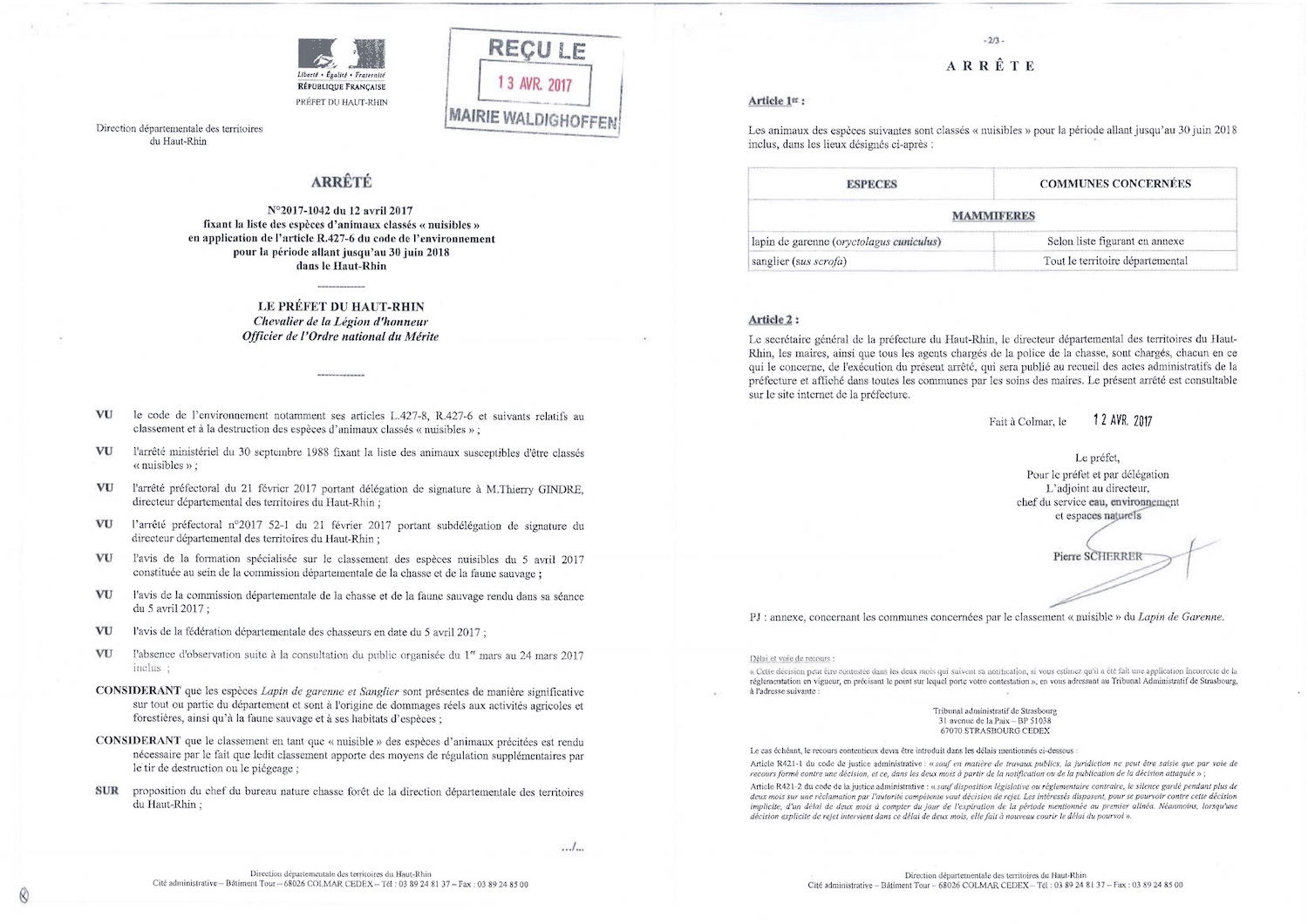 Arrêté n 2017-1042 du 12 avril 2017 fixant la liste des espèces d'animaux classés "nuisibles" pour la ériode allant jusqu'au 30 juin 2018 dans le Haut-Rhin.