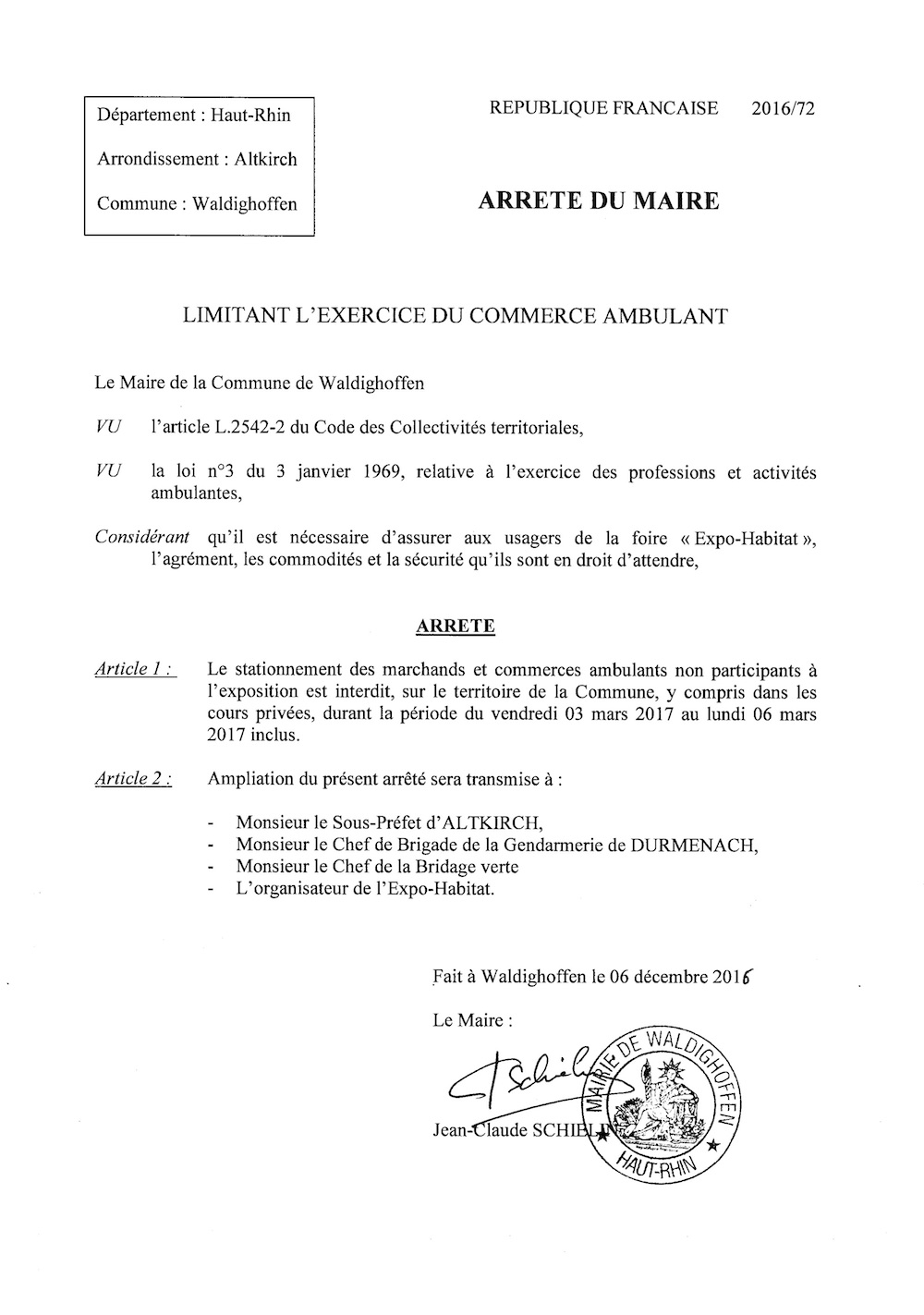 Arrêté limitant l'exercice du commerce ambulant qui ne participe pas à l'Expo-Habitat durant la période du 03 mars au 06 mars 2017 inclus