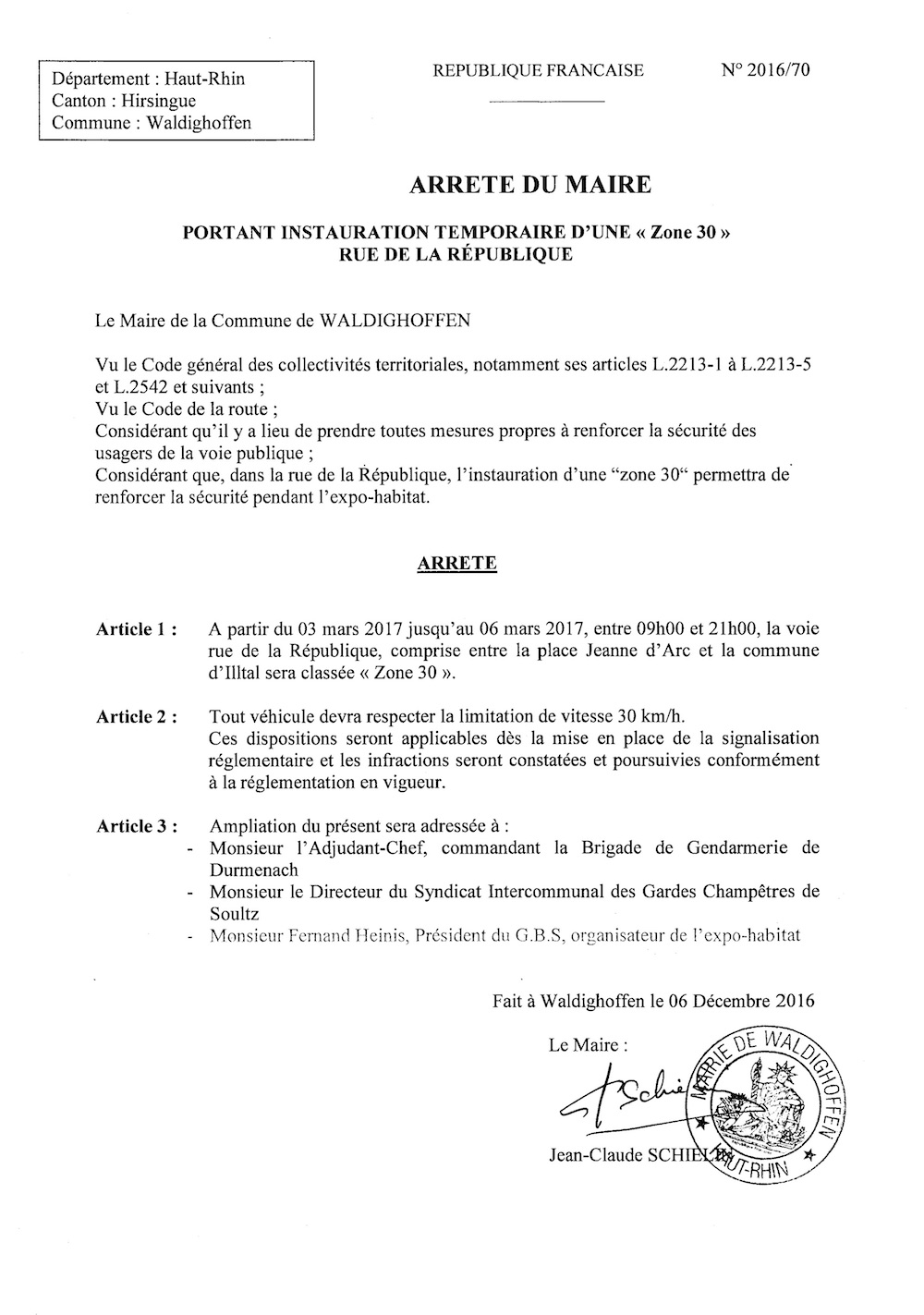 Arrêté portant instauration temporaire d'une Zone 30, rue de la République