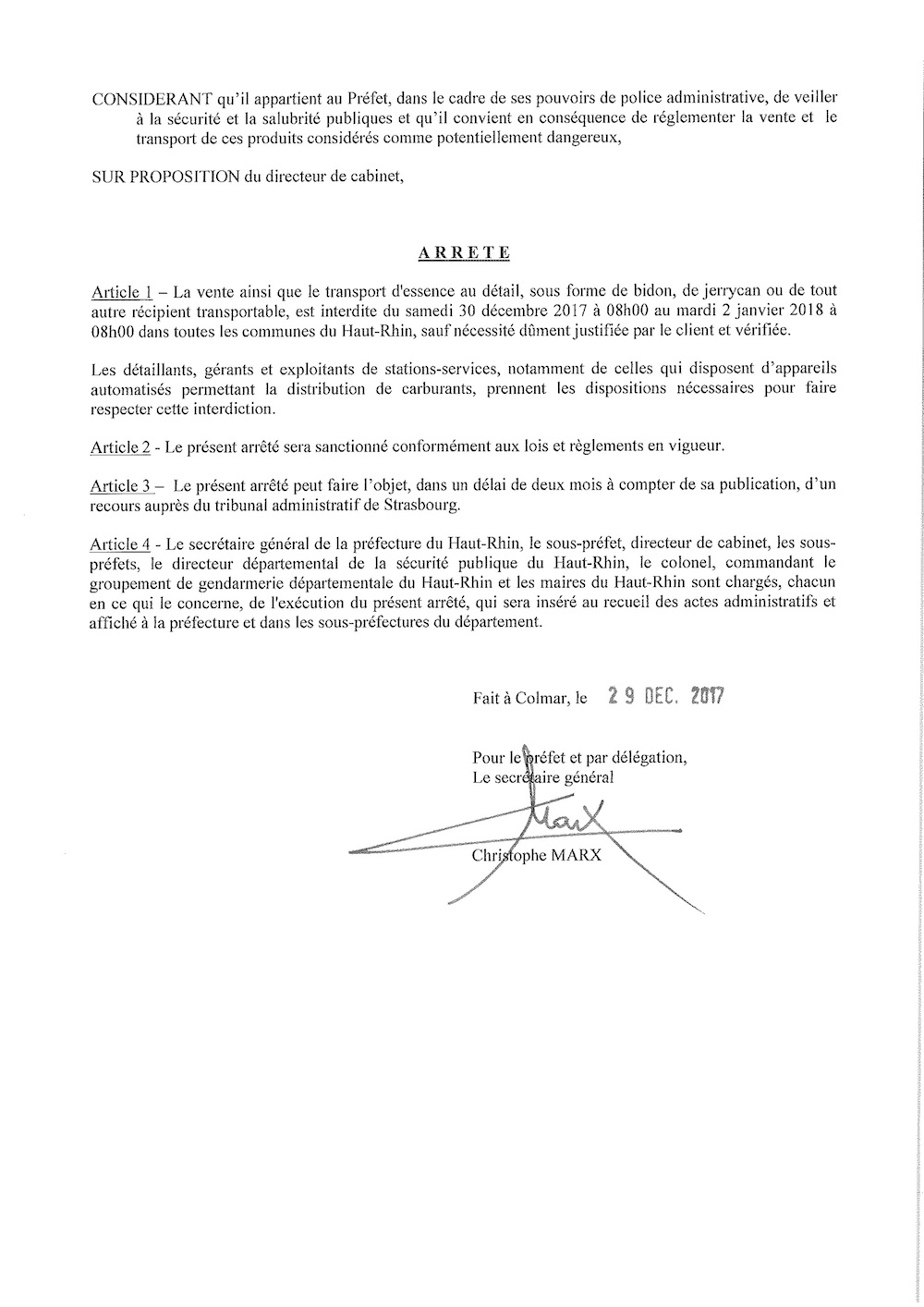 Arrêté portant interdiction de vente et de transport d'essence au détail
