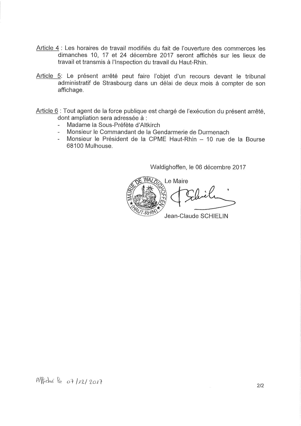 Arrêté portant ouverture dominicale et emploi de personnel dans les commerces pour les Fêtes de Noël 2017